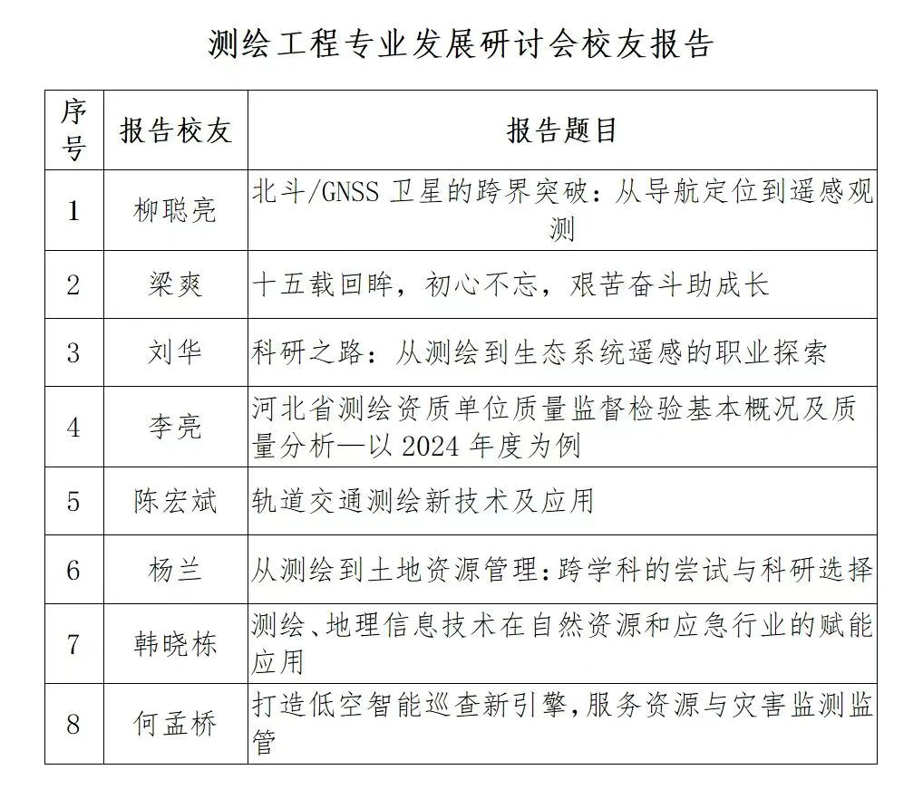 各专业发展研讨会成为此次活动的又一亮点。测绘工程专业研讨会上,校友们结合时代发展潮流和行业前沿趋势,提出测绘+AI+低空经济的专业发展方向,分享在职业发展和创业实践过程中的宝贵经验与深刻感悟。土地资源管理专业研讨会上,校友们对近几年行业发展情况和对毕业生的需求进行了介绍和分析,并表示将共同努力推动土地学科发展。城乡规划专业研讨会上,校友们提出了校企合作共赢模式等切实可行的建议,从事自媒体博主的校友还主动提出协助推广专业公众号。地理信息科学专业研讨会上,从事开发工作的校友们普遍认为专业在人才培养与建设上具有独特优势与不可替代性,并建议在课程体系建设上增设与行业趋势发展相关的实践性、创新性课程。遥感科学与技术专业研讨会上,校友们分享了遥感技术在各领域的应用和实践经验,并表达了与学院加强合作、共同推动遥感技术发展的强烈意愿。通过此次座谈,学院收集了校友们对人才培养方案修订、课程体系改革、实践能力加强、AI技术融合及产学研校企合作深化等方面的诸多建设性建议和意见。