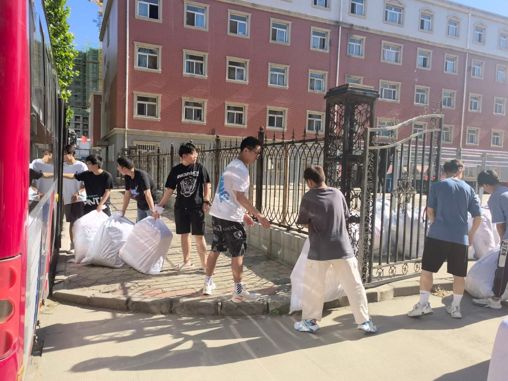 于淑会老师跟随搬迁学生一起前往校本部,学院党委书记白翠玲、党委副书记李光、2019级辅导员李明云指挥并亲自参与卸载行李,采用“接龙传递”的方式,使卸载搬运工作高效、省力、有序进行。