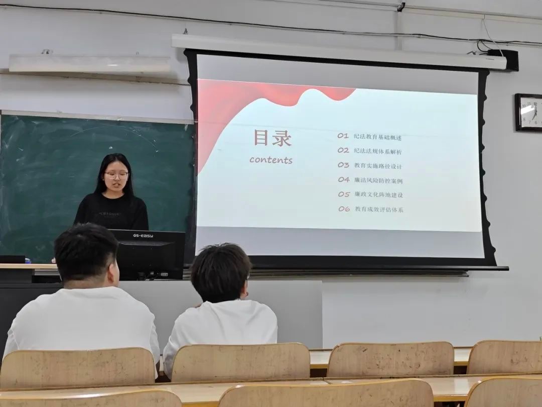 主讲人段媛媛通过解读纪法教育开篇,简单明了的分析了廉洁教育的基本概念,指出教育对象分层以形成全覆盖的教育体系,明确运用“理论+案例+实践”的三维模式强化教育结果,并指出了“权力约束机制、价值塑造功能、制度协同效应”三大纪法核心体系目标,阐述出教育活动的现实意义。 而后她在深入讲解纪法法规体系时,点明我国通过廉洁从政的基本框架、纪律处分核心条款和法规执行监督体制构成了完善的预防、规范、监督以及惩处的体系。