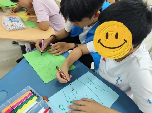 待小朋友们绘画结束后,讲解员邀请他们分享自己的作品,讲述他们自身对地图的理解。随后讲解员利用小朋友们的绘画成果,将局部的小地图引申到国家地图,并着重强调国家版图的重要性。此次活动不仅丰富了特殊儿童的精神世界,也增强了他们对国家的归属感和荣誉感。