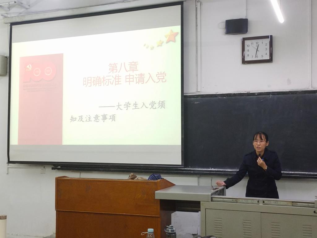 第九场党课培训于2021年10月5日12:30在教三101,由教工第三支部书记陈红娟老师带领大家学习。本党课主题为“明确标准 申请入党——大学生入党须知及注意事项”。围绕党组织吸收申请入党的同志入党,要严格履行入党手续,这是一项严肃的政治工作。陈红娟老师为了让入党的学生对这些手续以及入党流程有个清楚的了解,并让同学自觉地履行规定的手续,从“申请入党的条件”“党员的基本条件”“入党积极分子的确定、教育和考察”“大学生入党流程及注意事项”四个方面进行讲解,通过陈红娟老师通俗易懂的讲解,我们对“入党”有更深刻的理解。接着,老师举了黄大年、黄文秀、廖俊波等优秀党员楷模的例子,明确党员也是劳动人民中的一员,我们青年学生要牢记党的嘱托,担当尽责,无私奉献;对党忠诚,心系群众,忘我工作;一腔赤诚,敢为人先,以祖国富强、民族振兴、人民幸福为己任,不负韶华,持续奋斗。
